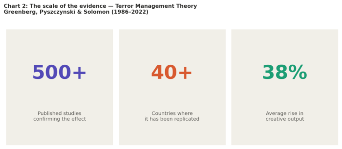 Three researchers — Jeff Greenberg, Tom Pyszczynski, and Sheldon Solomon — spent the next four decades testing this idea in controlled experiments. They called it Terror Management Theory.
