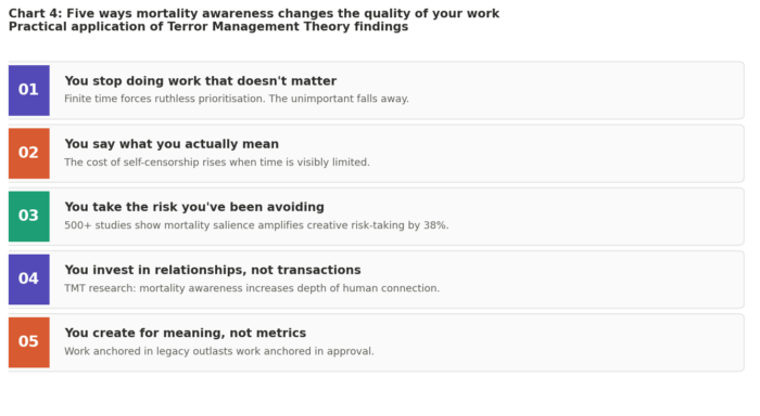 The research does not require a dramatic near-death experience. The studies show that even a brief, deliberate engagement with mortality — a few minutes of honest reflection — is enough to shift creative behaviour in measurable ways.