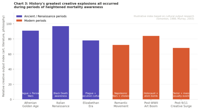 The post-World War II art boom. The Elizabethan literary explosion. The Romantic movement, written against a backdrop of Napoleonic Wars and cholera outbreaks. In each case, the proximity of death did not suppress human creative output. It ignited it.